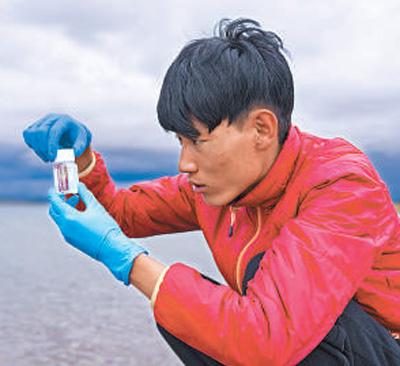 纳木错站观测主管达瓦扎西在取样。本报记者 徐驭尧摄