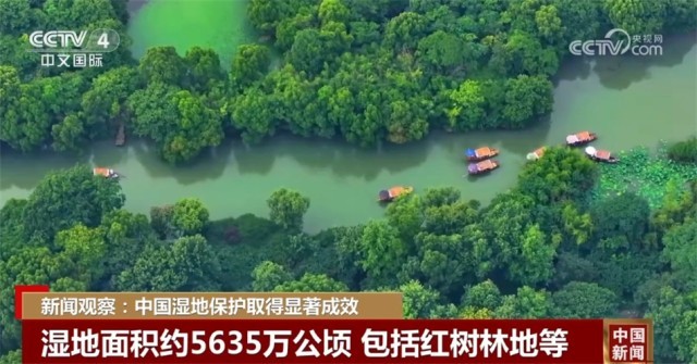 根据最新调查结果,中国湿地面积约5635万公顷,包括红树林地、森林沼泽、灌丛沼泽等。目前,中国有82处国际重要湿地、29处国家重要湿地、903处国家湿地公园、13个国际湿地城市,中国湿地保护体系初步建立。约90%的国家湿地公园向公众免费开放,成为民众共享的绿色空间。