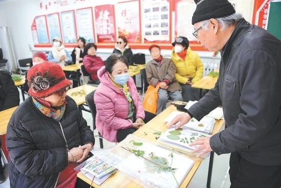 在陈之欢的带领下,居民认识了社区里的毛白杨、圆柏、银叶菊等植物,了解它们的特征和属性。冬日里寒风阵阵,但大家的热情始终不减。随后,陈之欢又将课堂从室外转到室内。在社区综合活动中心里,他带领大家用捡拾的落叶制作标本。