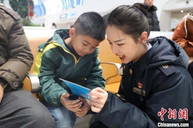 中新网嘉兴2月2日电(胡丰盛 胡晨琦 王敏)“别跑了,你坐好,人太多了!”2月2日是中国传统的“小年”,浙江嘉兴,中国铁路上海局嘉兴站北候车室一位男旅客追赶着一个小孩。在“红船”雷锋服务站的陈峥怡和孟雨婷注意到了这一大一小两位旅客,很明显这位年轻的男士对跑闹的小孩有点束手无措。