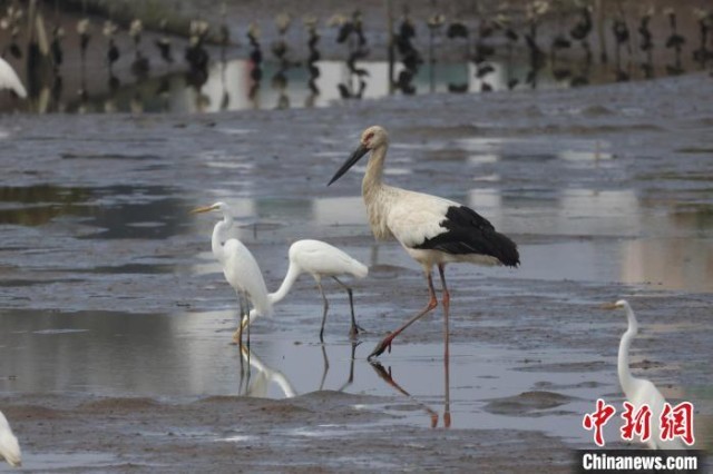 东方白鹳与其他水鸟。广东省林业局 供图