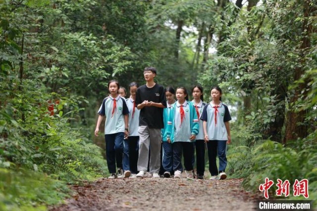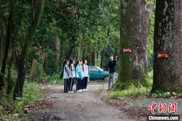 6月4日,广西柳州市柳城县古砦仫佬族乡组织古树保护科普活动,林业工作者向孩子们科普古树保护知识,让孩子们能坚持保护生态环境,留住“乡愁”。在古砦仫佬族乡大户村新维屯360多亩“原始”森林中,有树种200多种,各类药材100多种,百年以上的古树20多棵。过去的几十年里,村民制定村规民约自发保护树木。郁郁葱葱的树木,与村旁的房子“融为一体”,构筑成新维独特的气脉。图为林业工作者带领孩子们参观古树林。汤晓逵 摄