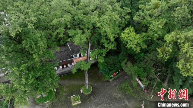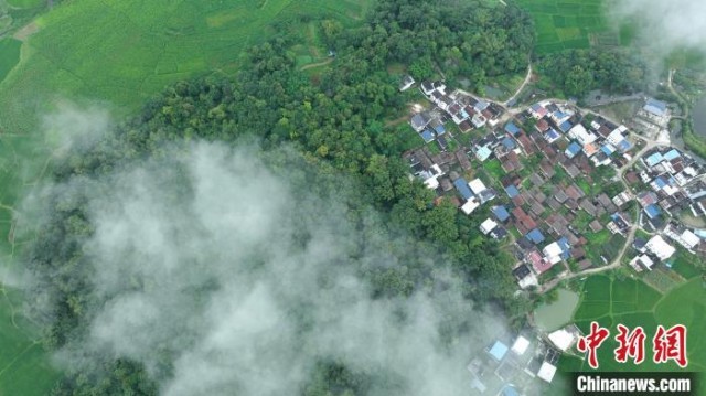 6月4日,广西柳州市柳城县古砦仫佬族乡组织古树保护科普活动,林业工作者向孩子们科普古树保护知识,让孩子们能坚持保护生态环境,留住“乡愁”。在古砦仫佬族乡大户村新维屯360多亩“原始”森林中,有树种200多种,各类药材100多种,百年以上的古树20多棵。过去的几十年里,村民制定村规民约自发保护树木。郁郁葱葱的树木,与村旁的房子“融为一体”,构筑成新维独特的气脉。图为航拍新维屯全景。(无人机照片) 汤晓逵 摄