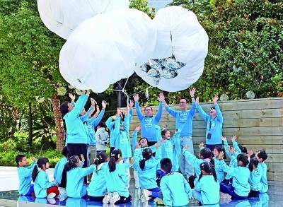 在上海浦东美术馆,孩子们与设计师团队共同打造并升起“气候云”艺术装置。新华社发