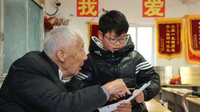 中国青年报客户端讯(刘琴 中青报·中青网记者 杨宝光)3月7日,99岁安徽和县卜陈学校退休教师叶连平,迎来新学期第一课。孩子们还没到,叶连平在每张课桌上放好本子、笔和打印好的学习资料,整理妥当,静静等着孩子们到来。在和县乌江镇卜陈未成年人之家,他为6名学生义务辅导,带领大家朗读英语时,他的眼睛几乎贴在纸面上,格外专注。课堂不大,学生不多,叶老师教得格外认真。三尺讲台,一生坚守。叶连平曾先后获得第七届全国道德模范“全国助人为乐模范”“最美奋斗者”“全国优秀共产党员”称号。