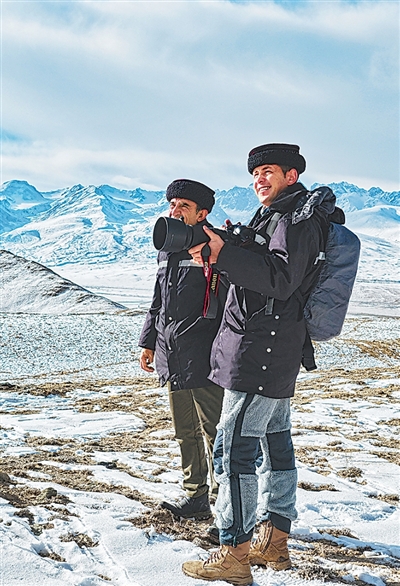 米路买买提·努尔俊(左)和同事依明江·胡达拜尔迪在巡护路上。
